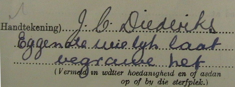 (PN) DIEDERIKS (NN) was born >1883 in Suid-Afrika. She died >1902 in Suid-Afrika. (PN) married Christiaan Petrus Adolf (Christian) DIEDERICKS on >1900 in Suid-Afrika. |